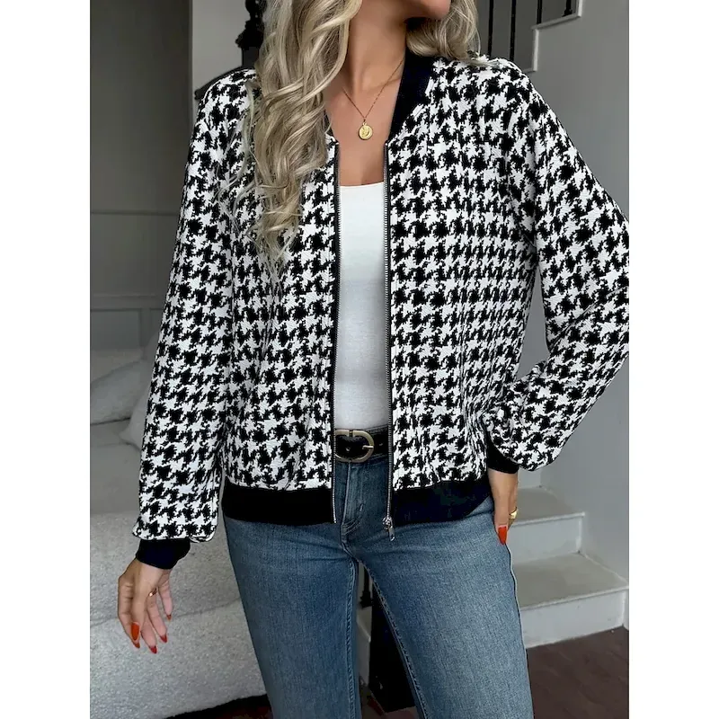 Women’s Casual Jacket Comfortable Breathable Zipper Print Casual Houndstooth Vacation Street Casual Daily Wear Zipper Regular Stand Collar Regular Fit Long Sleeve Outerwear Black Grey Black Summer