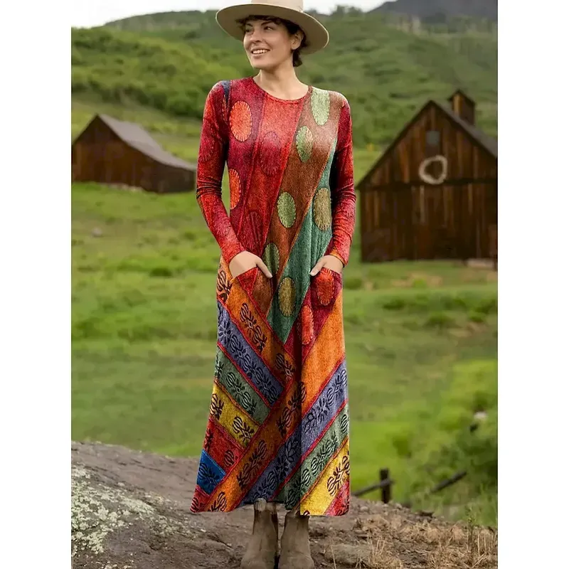 Women’s Maxi Dress T Shirt Dress Tee Dress Casual Daily Going out Regular Fit Graphic Geometric Long Sleeve Crew Neck Red Light Brown Orange Brown Summer Spring Fall