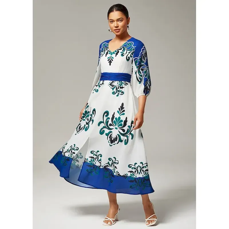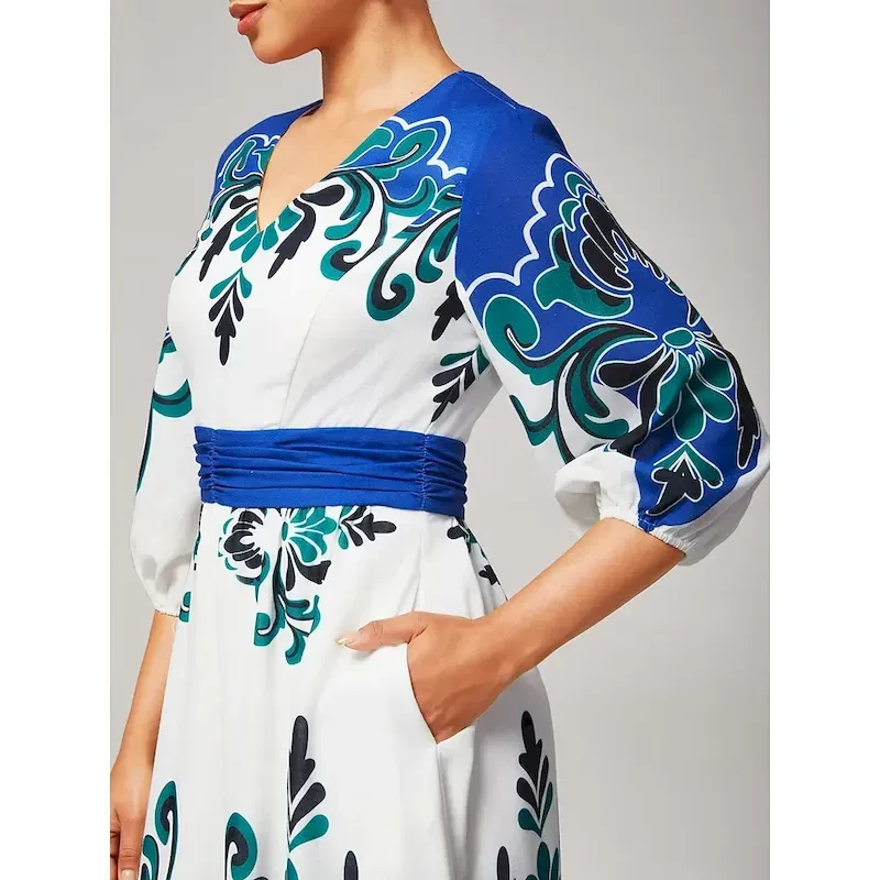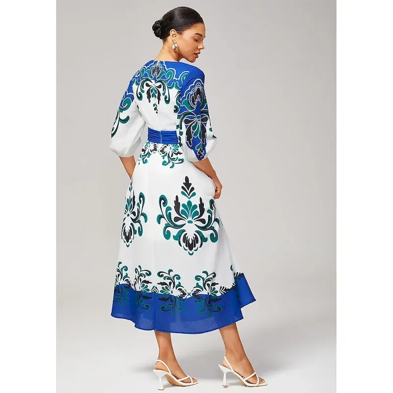 Women’s Bold Multicolor Print Faux Cotton Linen Teal Tea Dress Elegant Stylish Friend Gatherings Afternoon Tea Fall
