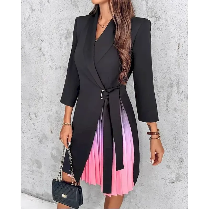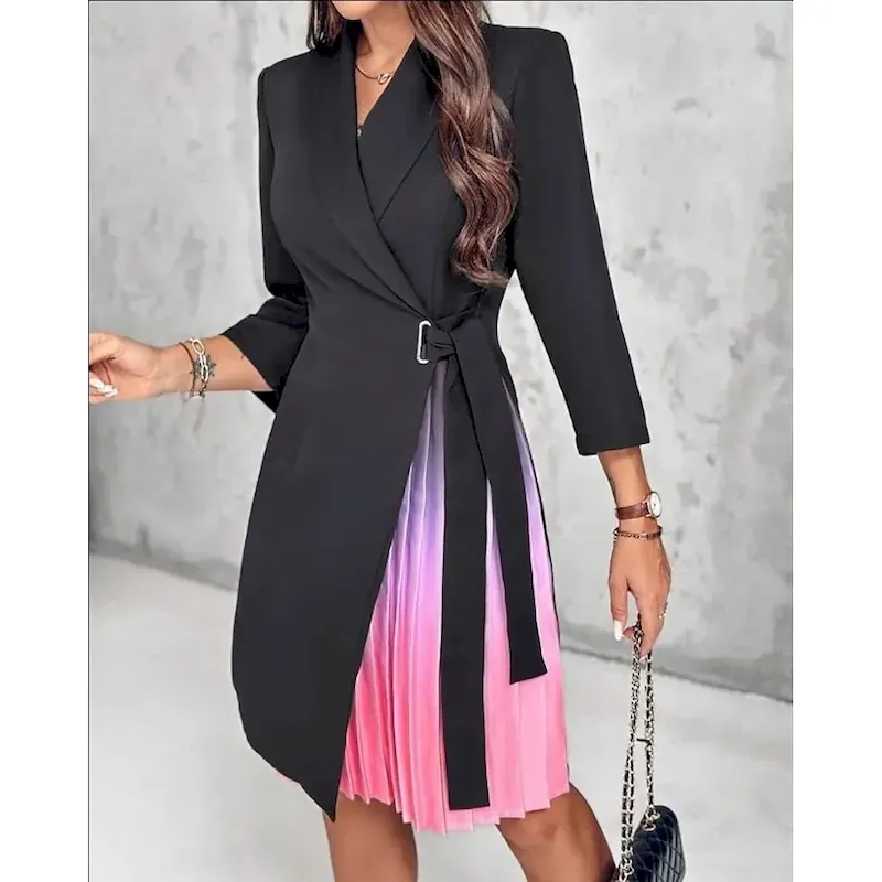 [Design]: The dress features a sophisticated patchwork design, with a lapel neckline adding a classic touch. The tailored blazer-style top with a wrap-around belt accentuates the waist, while the pleated mini skirt showcases a trendy ombre gradient from soft pink to a deeper shade, adding both texture and visual interest. The long sleeves contribute to the overall chic, modern aesthetic.