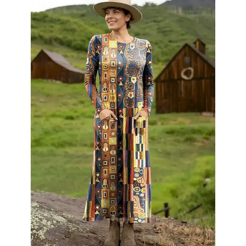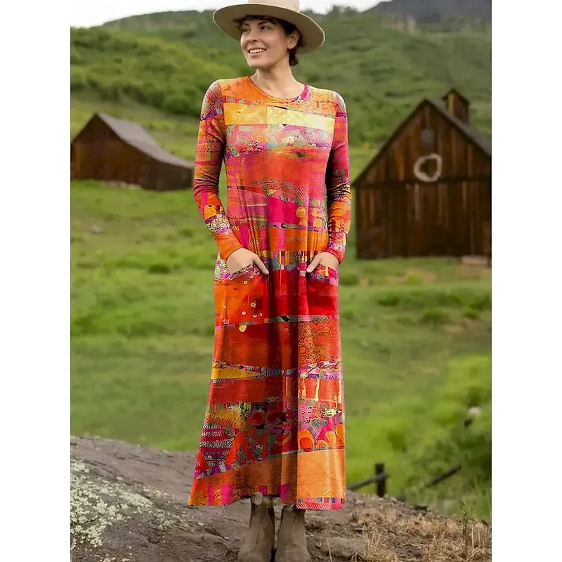 Women’s Maxi Dress T Shirt Dress Tee Dress Casual Daily Going out Regular Fit Graphic Geometric Long Sleeve Crew Neck Red Light Brown Orange Brown Summer Spring Fall