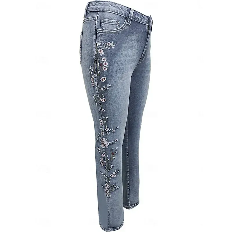 Women’s Normal Jeans Stylish Retro Vintage Full Length High Waist Floral Pocket Comfy Breathable Micro-elastic Outdoor Street Blue Spring & Fall Spring, Fall, Winter, Summer Regular Fit