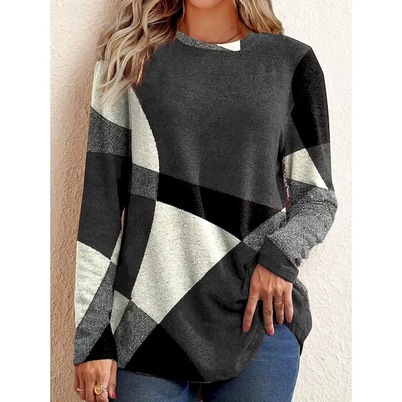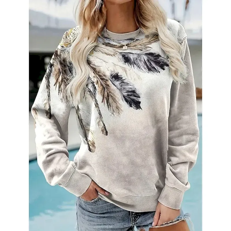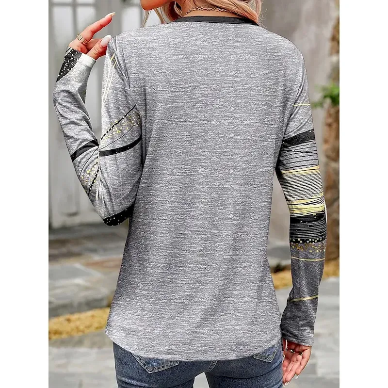 Women’s T shirt Long Sleeve Crew Neck Long Sleeve Tunic Casual Print Regular Tops Daily Light Grey Spring Fall Prefall